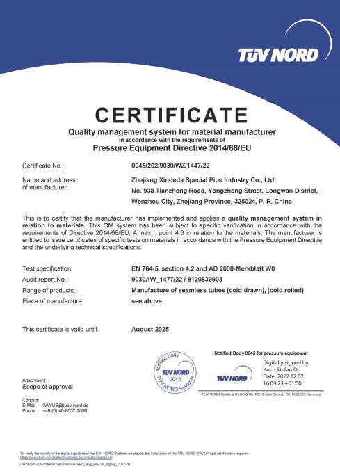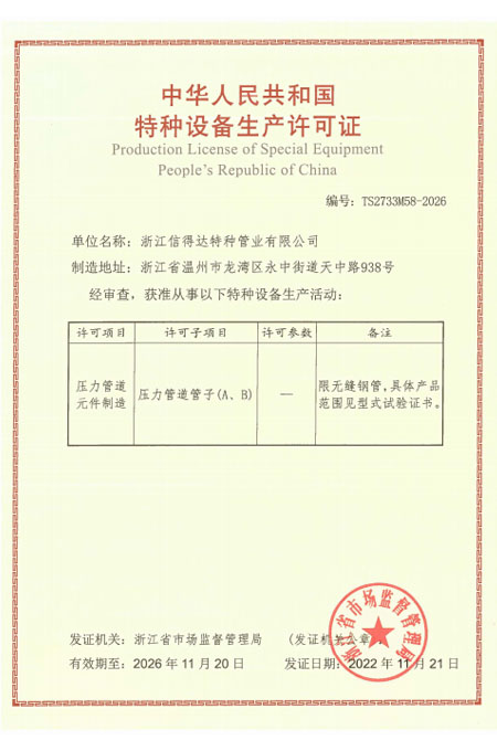 公司已全面通過了ISO9001:2008質量管理體系認證、14000環境管理體系認證、18000職業健康管理體系認證、國家質量檢驗檢疫總局A2-B類壓力管道元件制造許可、 歐盟PED認證及德國AD-2000產品強制認證、美國ASME材料產品認證、信得達擁有1條穿孔生產線,10條冷拔生產線8條冷軋特種無縫鋼管生產線。